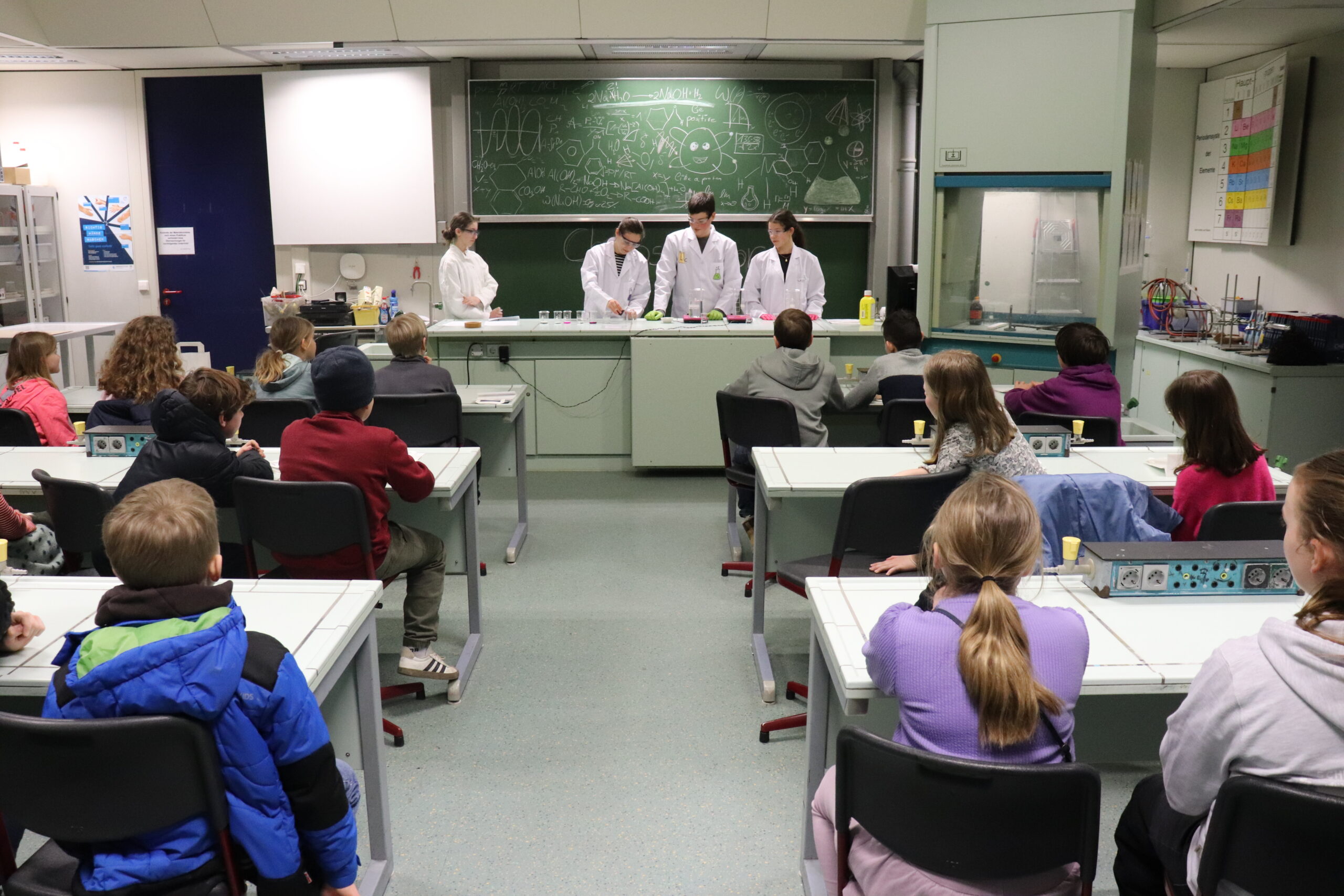 Im Anschluss daran konnten die Eltern und Angehörigen sich selbst ein Bild vom Schulleben und den Räumlichkeiten machen. In von Lehrkräften geführten Gruppen durchliefen sie neun Stationen, die Einblicke in Unterrichtsinhalte (Moderne Fremdsprachen, NWT bzw. neu NIT – Informatik kommt hinzu, Biologie und BK), Schulorganisation (Schulleitung, SMV, Freundeskreis, offene Ganztagesschule) und Ausstattung der Klassen- und Fachräume mit moderner Technik gaben. Das Profil der Schule gewann dadurch an Kontur. Die Sprachzertifikate DELE und DELF in Spanisch und Französisch, das Profilfach BK in der Mittelstufe sowie das Schülermentorenprinzip der Ganztagesbetreuung wurden durch eine lebhafte Vorstellung und den Dialog mit Lehrkräften und Schülerinnen und Schülern unmittelbar fassbar – vielleicht auch eine gute Entscheidungshilfe für die Schulwahl.