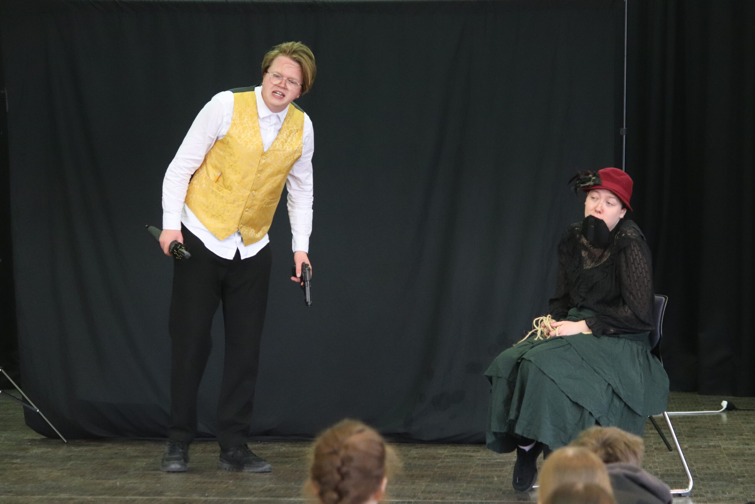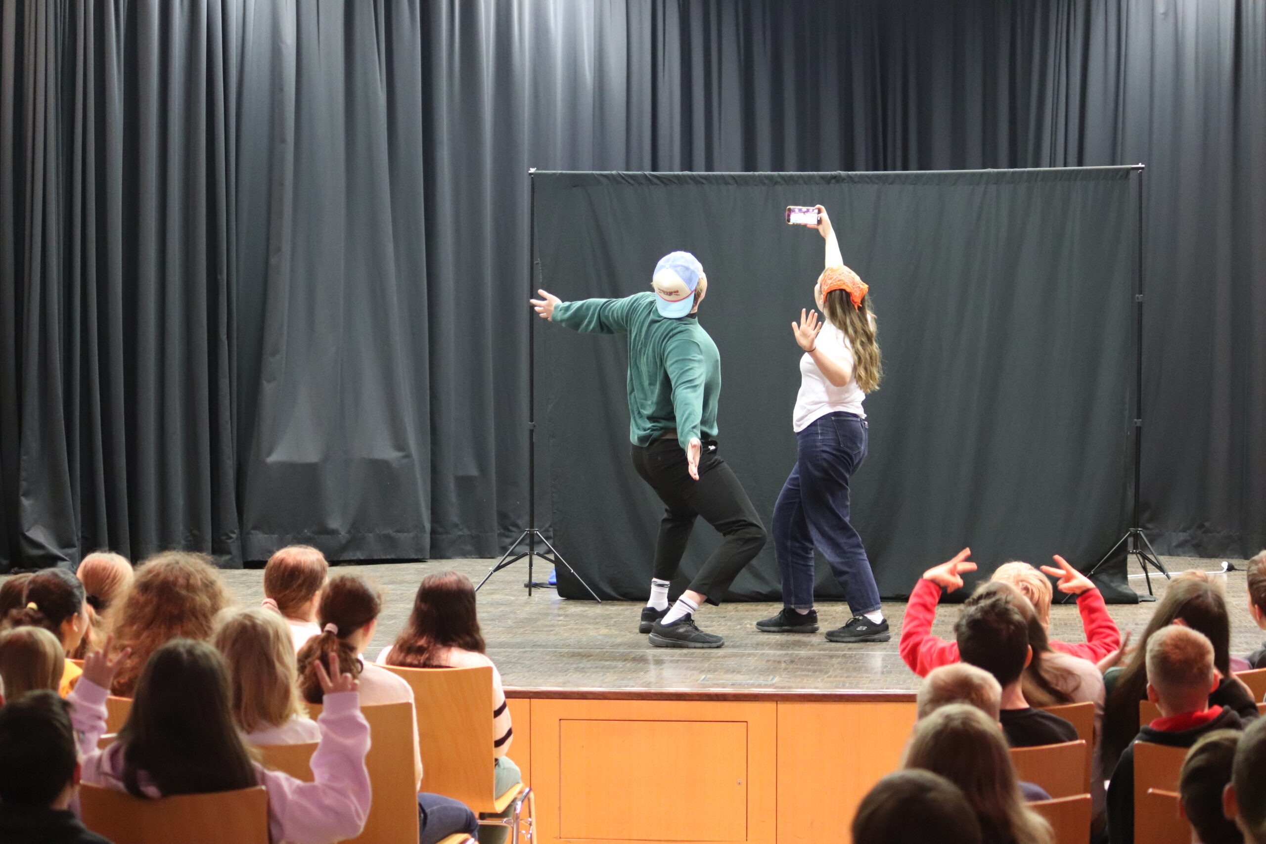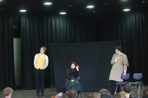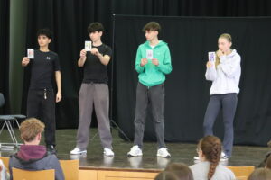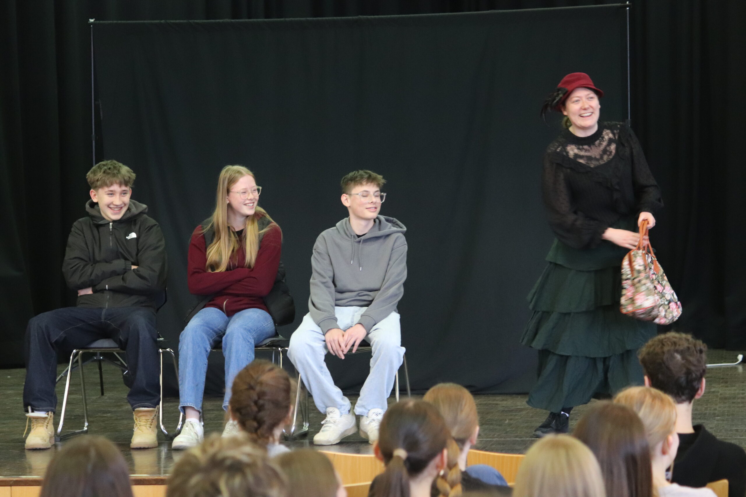 Für die Unterstufe hatte das Schauspielertrio das Stück Passing Tales im Angebot – die Geschichte von Jo, die die Sommerferien bei ihrer Großmutter auf der Isle of Skye verbringt. Ohne Internetverbindung und Fernsehen bleibt ihr nichts anderes übrig, als sich durch die Bücherei ihrer Großmutter zu arbeiten. Aus dieser Rahmenhandlung entspinnt sich eine interaktive Komödie und bestes Mitmachtheater.