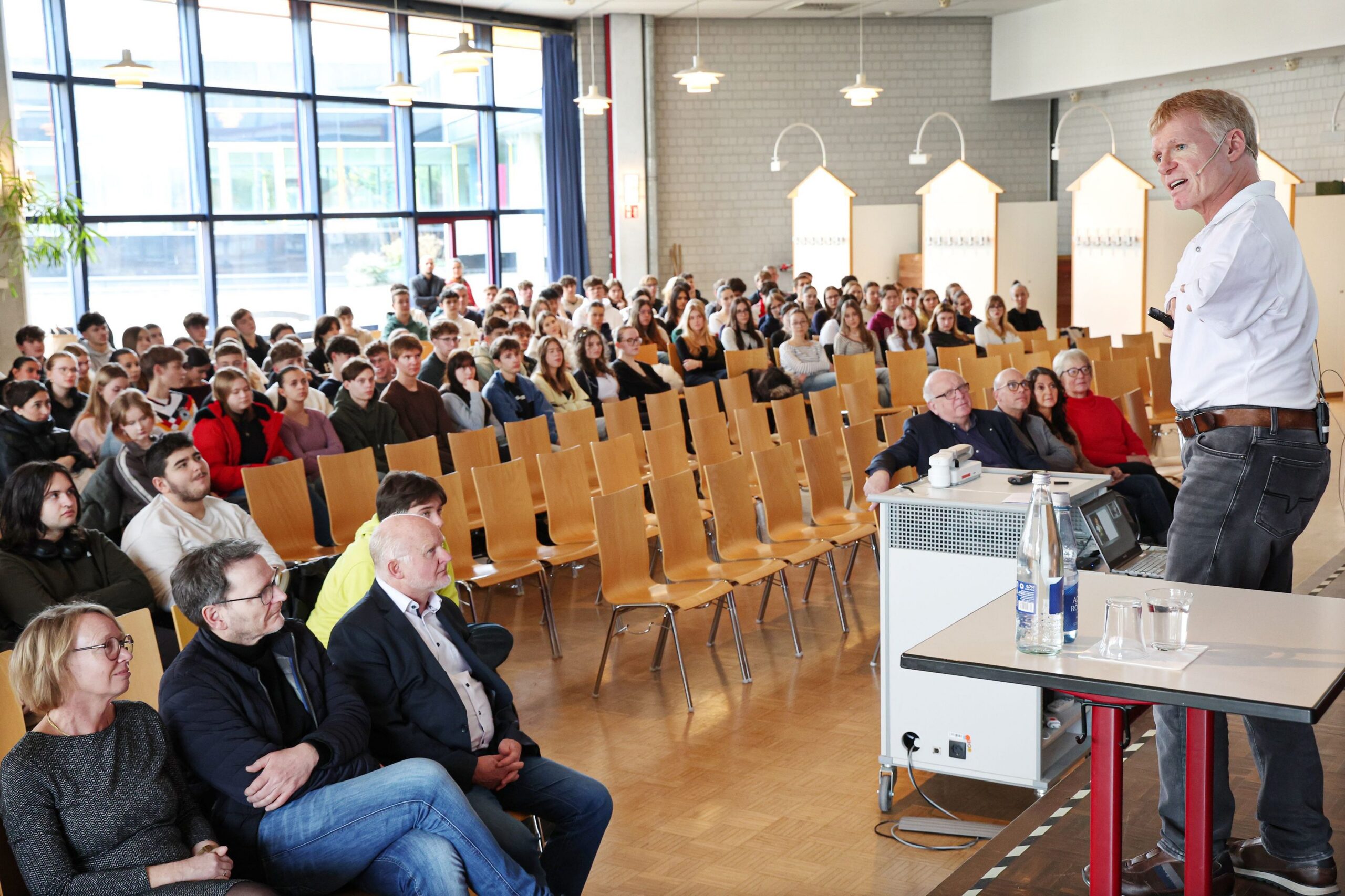 Wie er trotz dieses Umstands so erfolgreich werden konnte, erzählte Berg in seinem Vortrag „Mach was draus – Expedition zur inneren Kraftquelle“ in der Rede an die Jugend 2026 am 13. Februar, die jährlich von der Bürgerstiftung finanziert wird. Dieses Mal fand sie wieder in der Aula am Schulzentrum West statt, mit den Schülern der Oberstufe des Erasmus-Widmann-Gymnasiums und des Gymnasiums bei St. Michael als Publikum.
