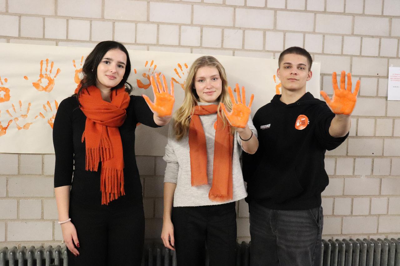 Große Informationsaufsteller erklärten der Schulgemeinschaft die Hintergründe des Orange Day und boten weiterführende Materialien an, wie zum Beispiel wichtige Telefonnummern oder Aufkleber mit dem internationalen Handzeichen für Gewalt. Ein besonderes Highlight war eine mehrere Meter lange Papierrolle, an der Schüler mit orangener Farbe ihre Handabdrücke hinterließen konnten – ein starkes Symbol der Solidarität und das Engagement gegen Gewalt.