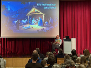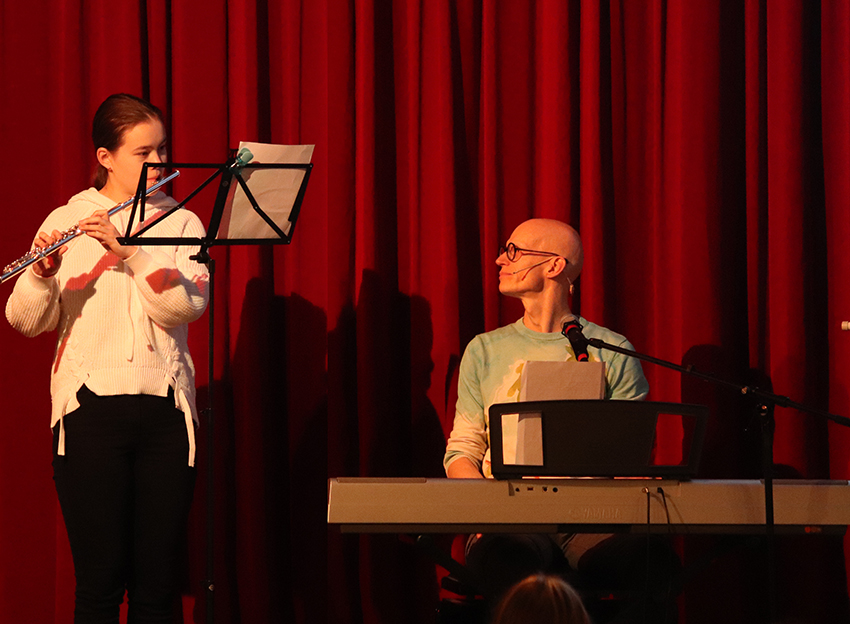 Er blieb dabei nicht nur Physiker und Astronom, sondern bediente Religion – er las aus der Bibel die entscheidenden Abschnitte aus dem Matthäus- und Lukasevangelium vor. Er bewies sich als Übersetzer – denn im griechischen Original sind es nicht „Weise aus dem Morgenland“, sondern Magier, also Sterndeuter. Er bemühte sich als Historiker um die zeitliche Einordnung. Und ganz am Ende war er sogar Musiker – unter der Begleitung seiner Tochter (Querflöte) sang er am E-Piano das Lied „Stern über Bethlehem“.