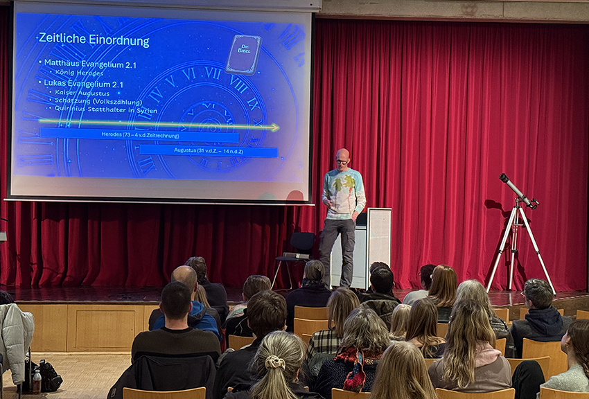 Ein vielseitiger und unterhaltsamer Vortrag – man durfte die Himmelskonstellationen der damaligen Zeit am Beamer betrachten und sich mit auf die Suche nach einer möglichen Lösung begeben.